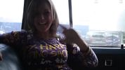 Девка с бритой киской демонстрирует дырочки во время поездки в машине в разных позах