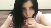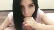 Брюнетка нализывает и насасывает хуй с громким причмоком, до самого окончания в рот