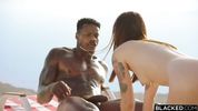 Пока муж уснул, телка сосет хуй огромному негру рядом на пляже, после чего уходит в номер с ним