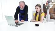 Молоденькая секретарша без трусиков соблазнила старого компьютерного мастера на куни и секс